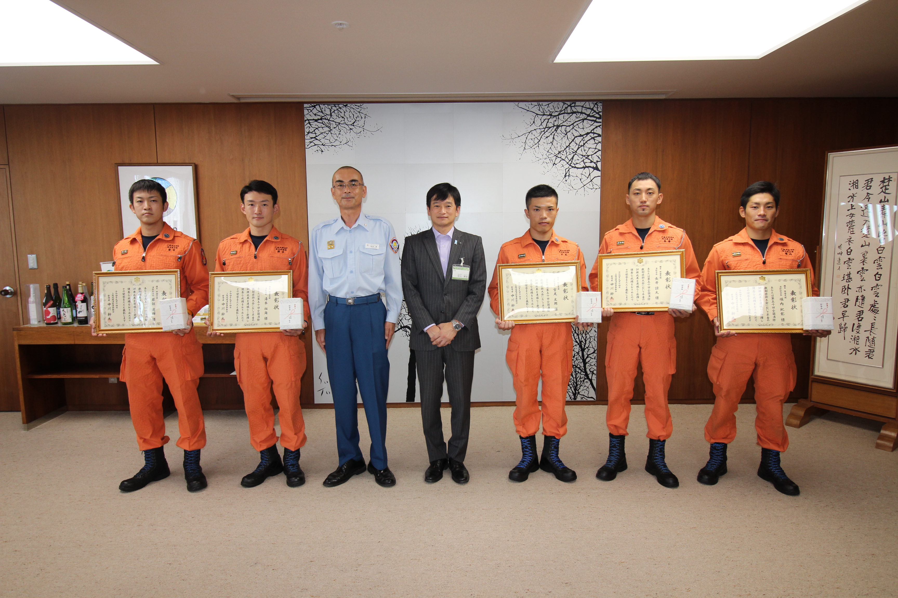 令和4年8月26日(金)東京都立川市で行われました 「第50回全国消防救助技術大会」 において、『障害突破』に出場し、入賞を果たした功績に対し、 組合管理者である中川上越市長から表彰状を授与されたものです。
