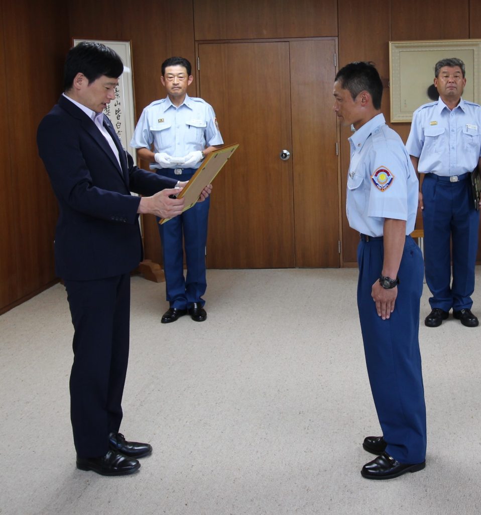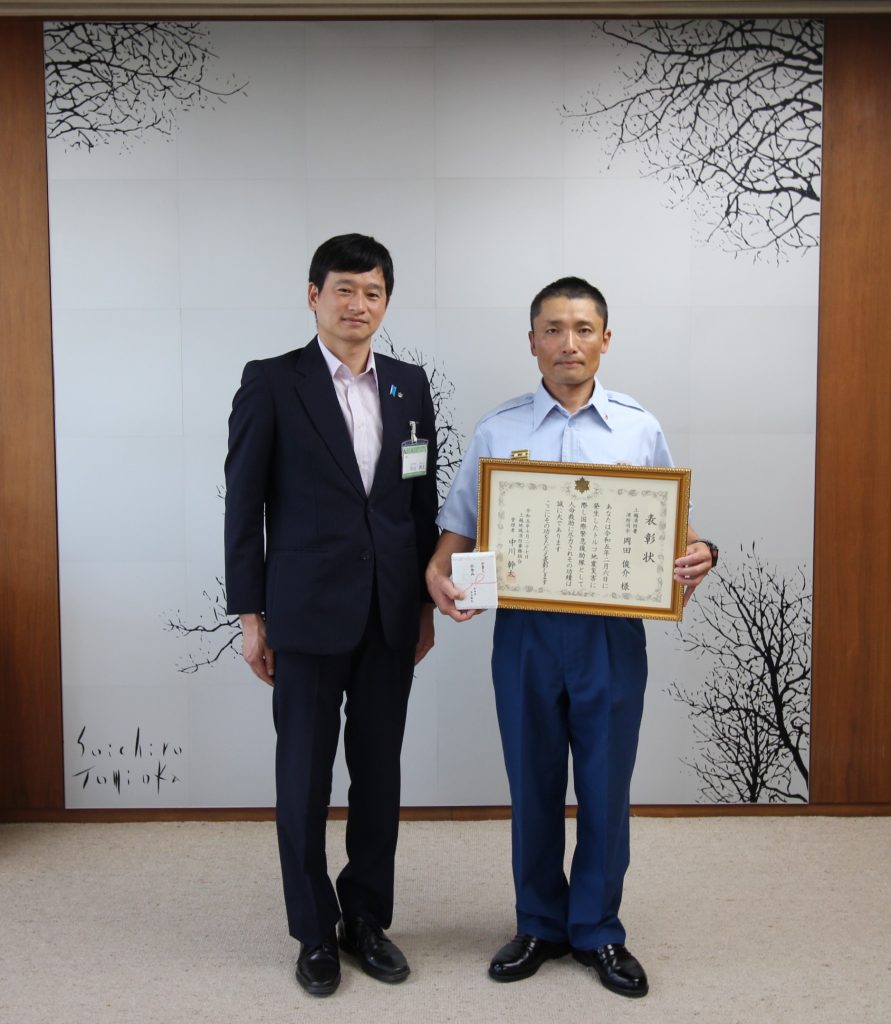令和5年2月6日に発生したトルコ地震災害に際し、国際緊急援助隊として派遣され功労があったとして、当局職員に総務大臣から感謝状が贈呈され、消防庁長官から国際協力功労章が授与されたことに伴い、組合管理者である中川上越市長から表彰状が授与されました。