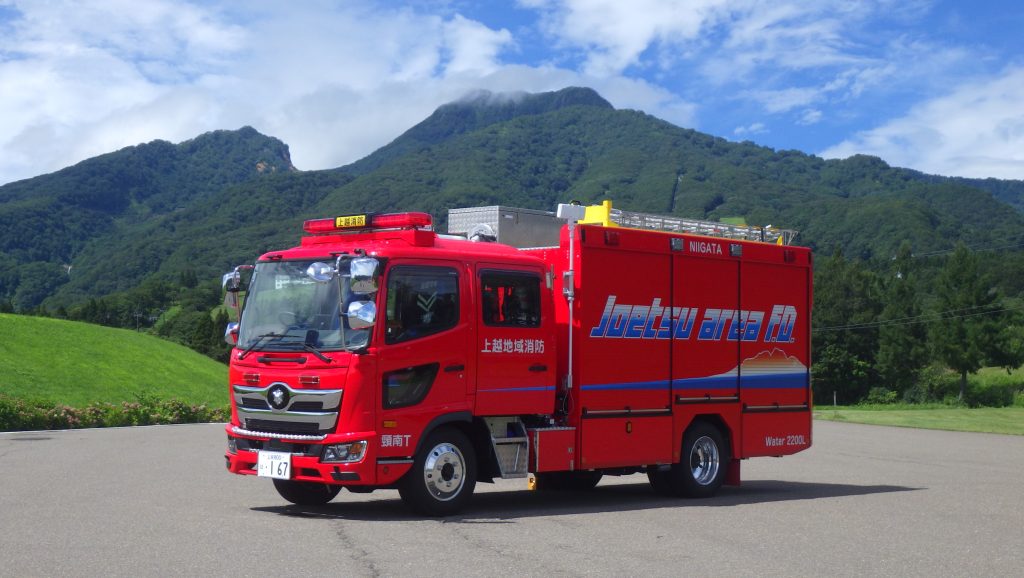 頸南消防署の水槽付消防ポンプ自動車を更新しました。 この車両は2,200リットルの水を積載し、火災現場直近に部署して消火活動を行うほか、山林や高速道路上など、消火用水の確保が難しい場所で迅速な消火活動に活躍します。 車体のデザインは、頸南地域の象徴である妙高山をイメージしました。 大規模災害が発生した時は、緊急消防援助隊として、出動する車両です。